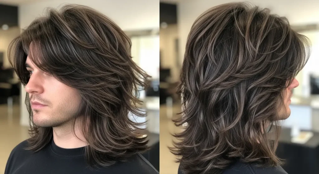 A shag-inspired masculine wolf cut softens layer transitions while maintaining texture and ruggedness. Blended layers create a retro-modern vibe, adding casual movement that is easy to style. Light blow-drying enhances the flow, while minimal product maintains a natural, masculine finish. This variation suits men who want a contemporary edge without extreme contrasts.